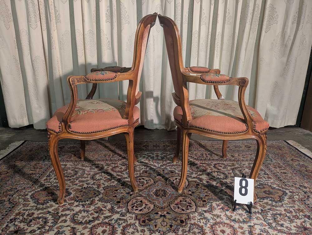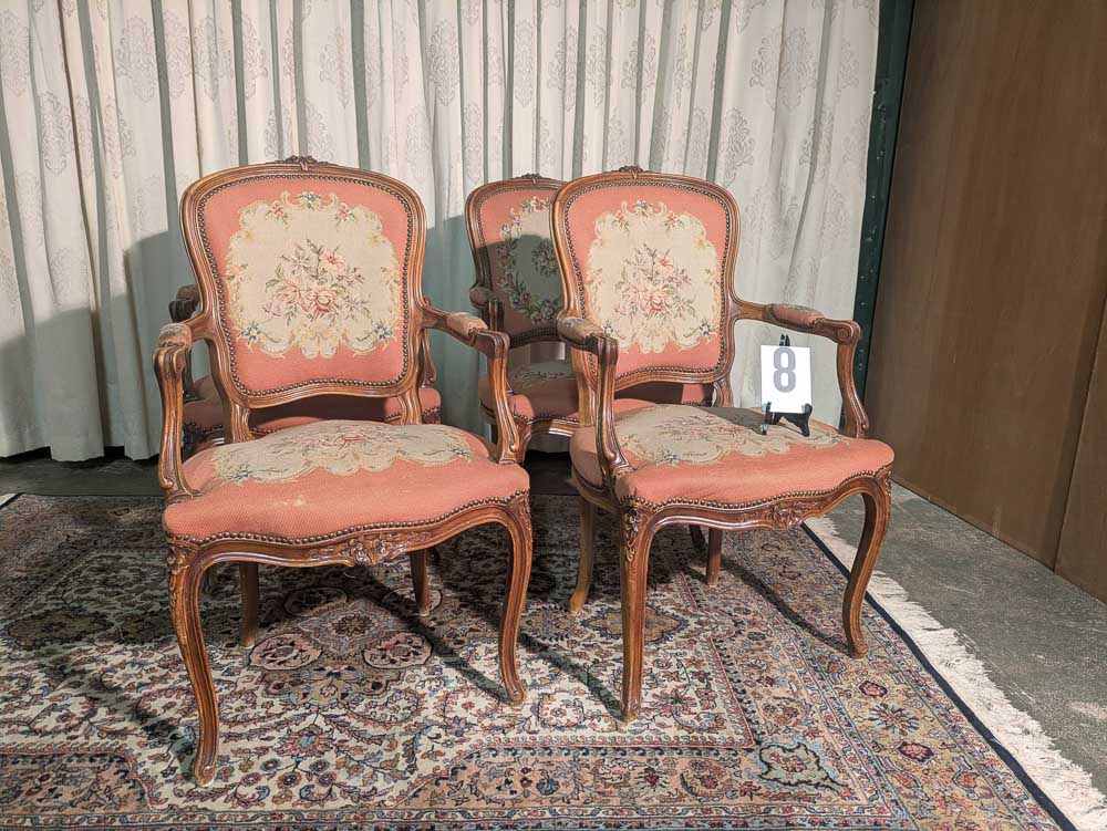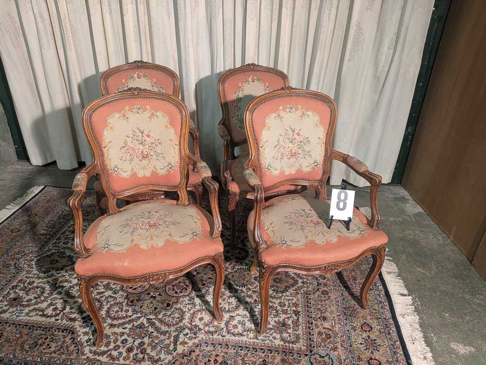 Set van 4 klassieke fauteuils in Louis XV / rococo stijl met prachtig houtsnijwerk en gebogen poten. De stoelen zijn bekleed met originele stof met bloemmotief en hebben een warme zalm/roze tint.